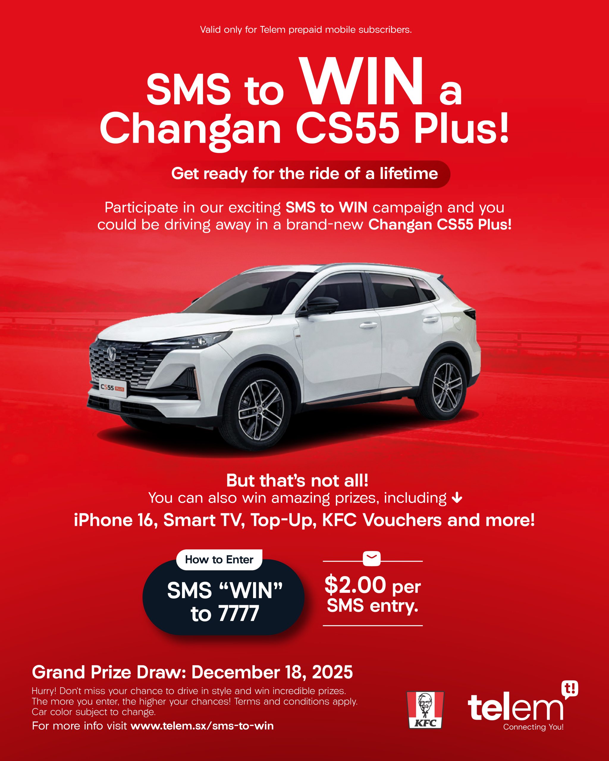 Telem is giving you the chance to win amazing prizes, including the grand prize—a brand-new Changan CS 55 SUV. Participating is simple. Telem prepaid customers can enter and win through multiple easy methods. The more you enter, the better your chances.